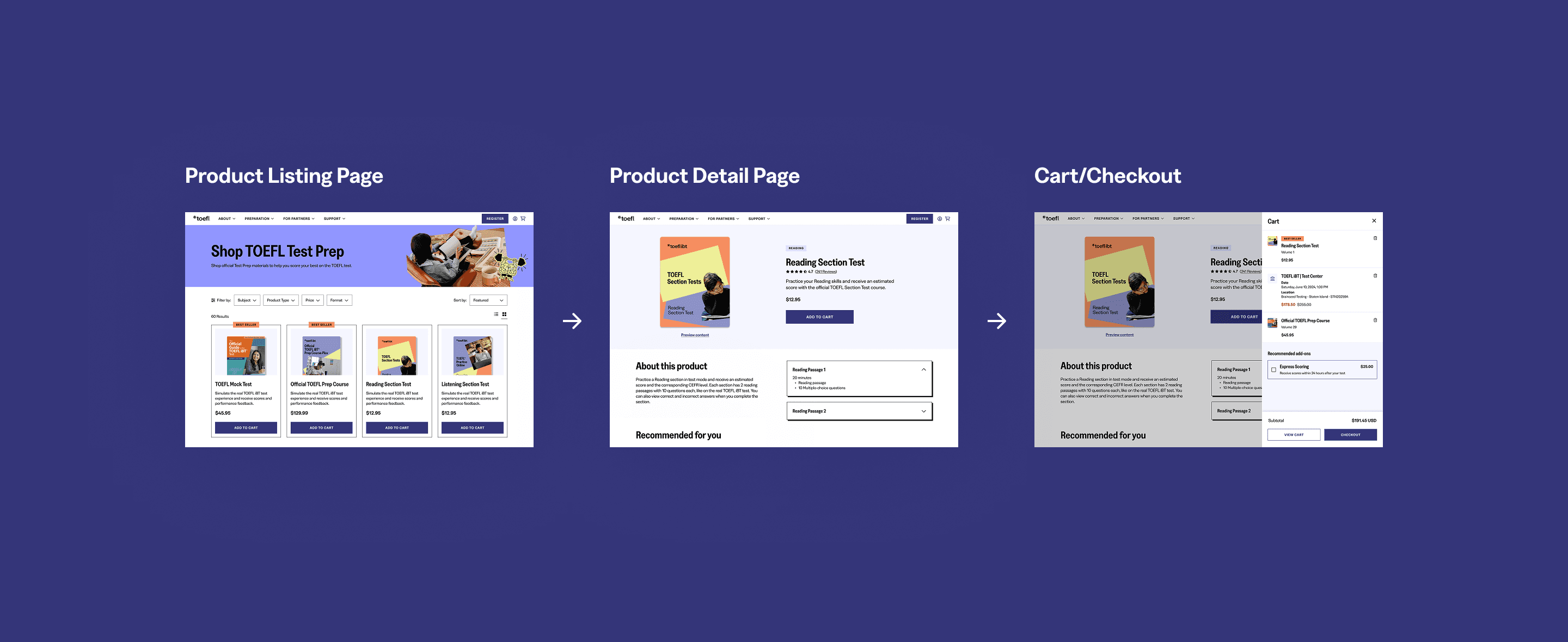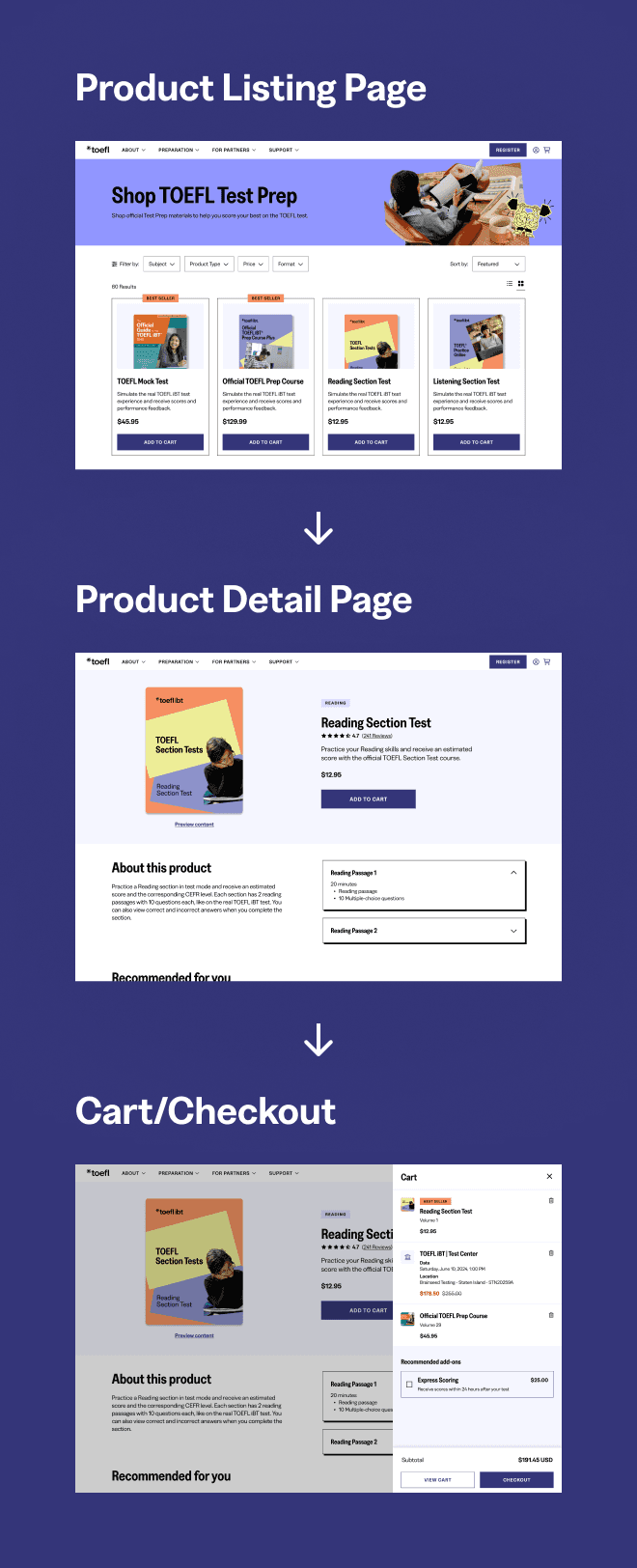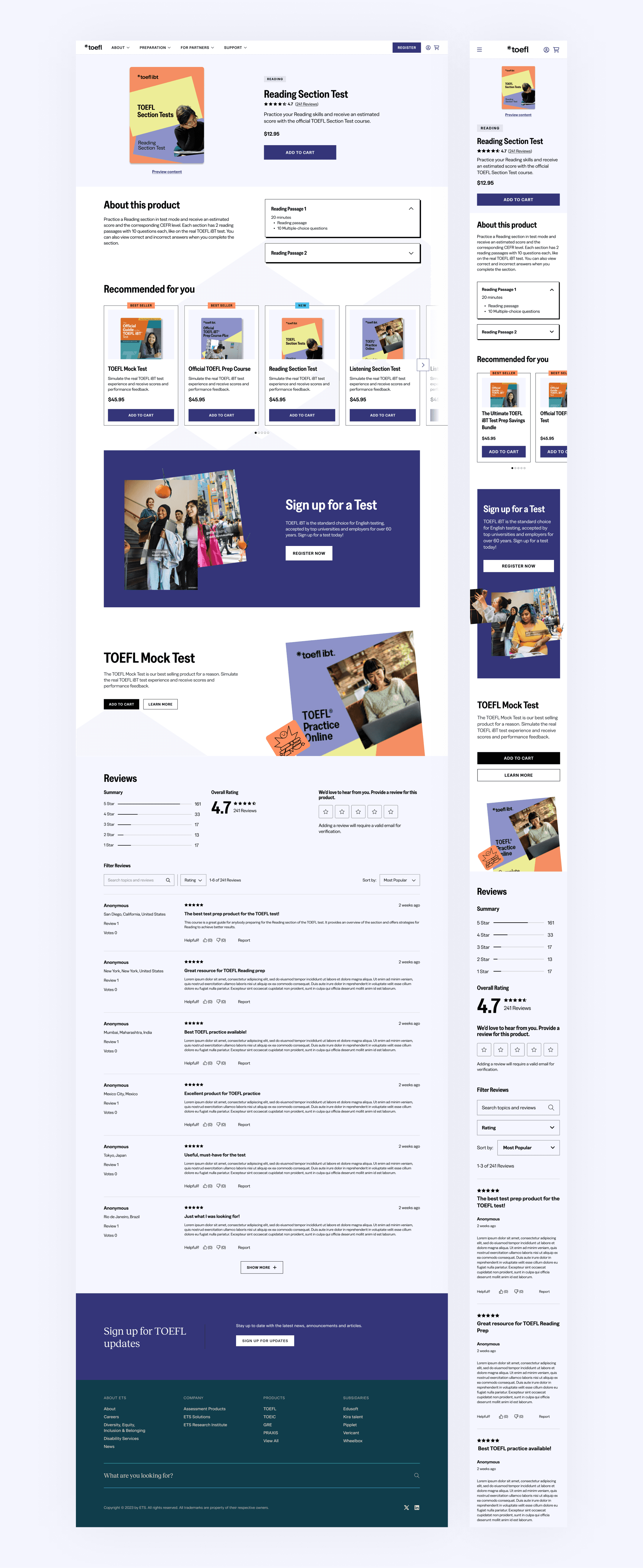 As of Fall 2025, the TOEFL website work is still in development and is slated to go live in 2026. The e-commerce pages we designed will be used as a benchmark for other ETS brands, such as GRE and Praxis.