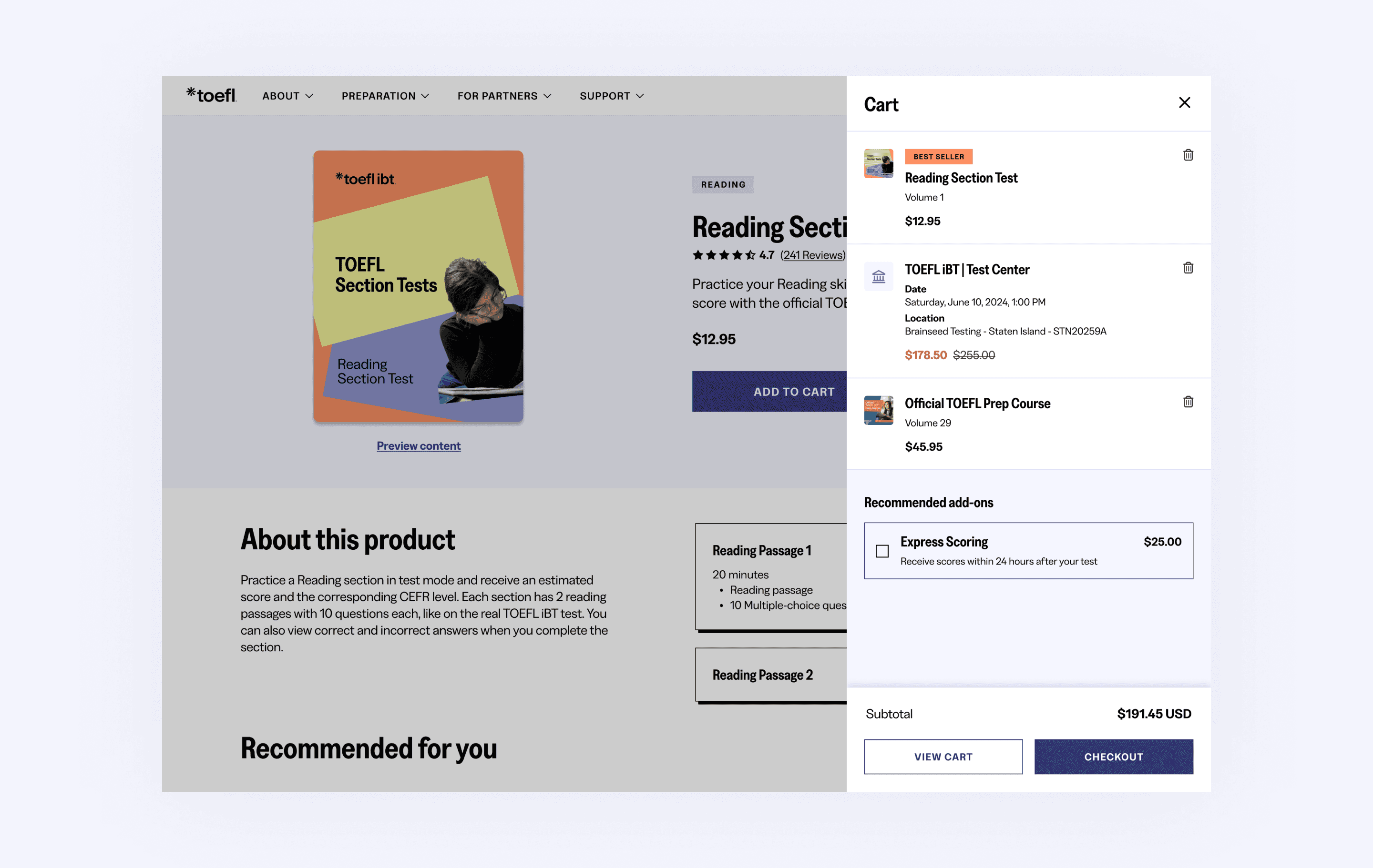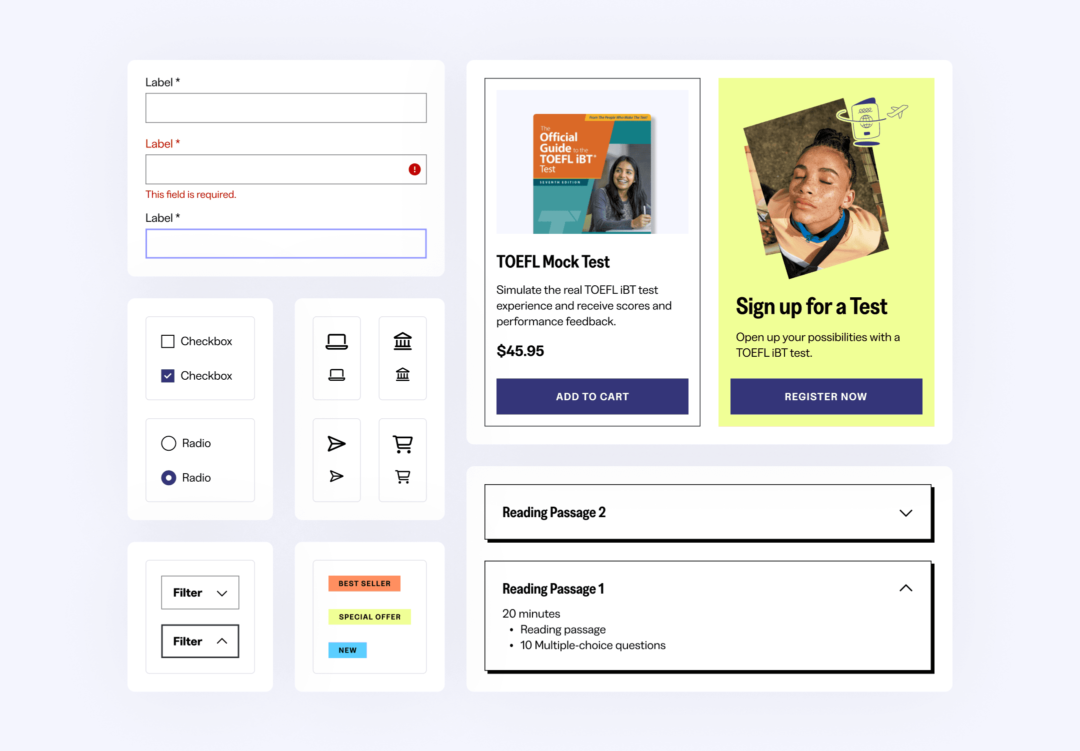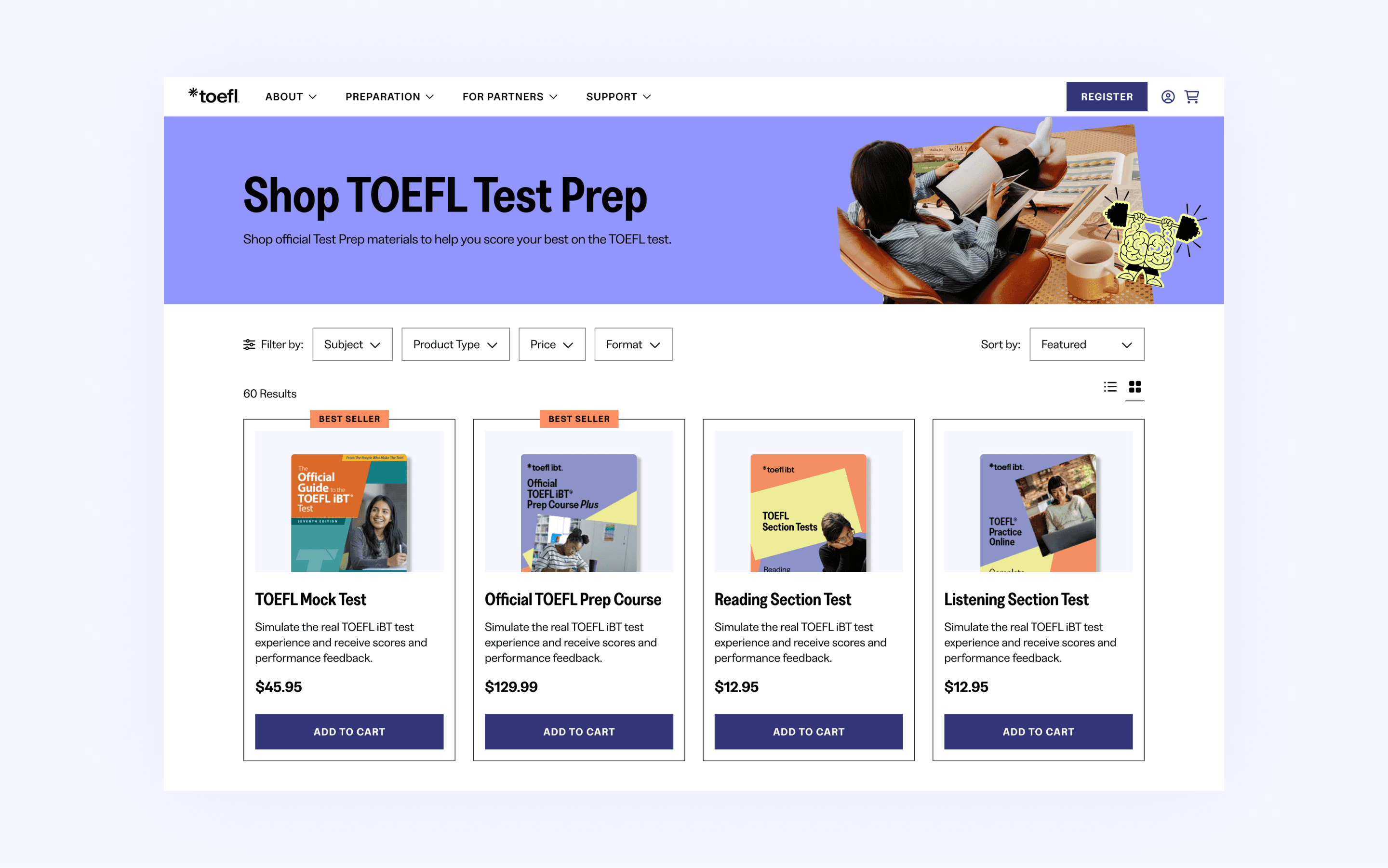 As of Fall 2025, the TOEFL website work is still in development and is slated to go live in 2026. The e-commerce pages we designed will be used as a benchmark for other ETS brands, such as GRE and Praxis.