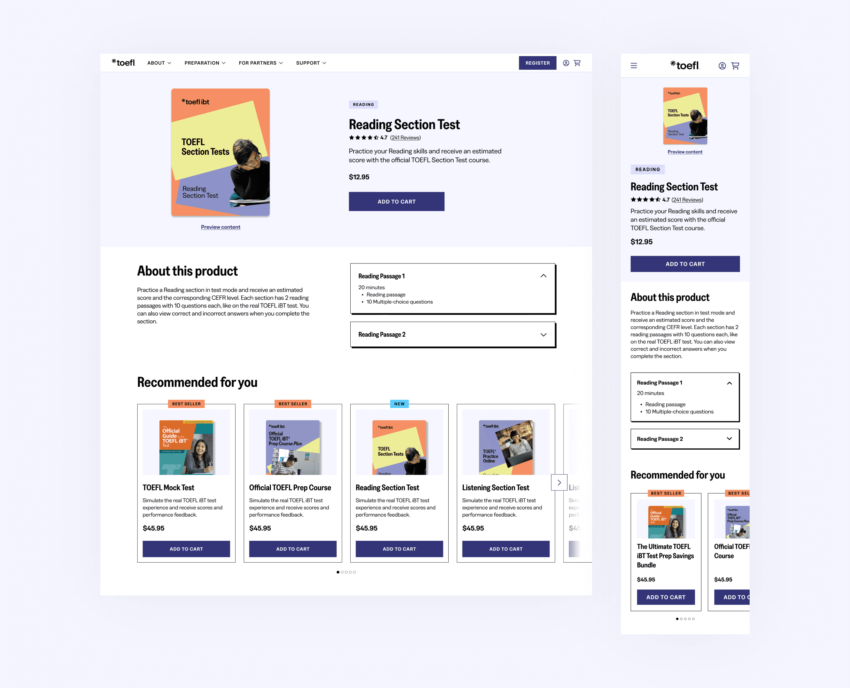 Test Prep products faced the same issue: they were locked behind a logged-in state, and sales suffered due to this lack of visibility. Mirroring the standard e-commerce patterns customers are used to, we created Product Detail Page and Product Listing Page templates that would work for their 50+ products.