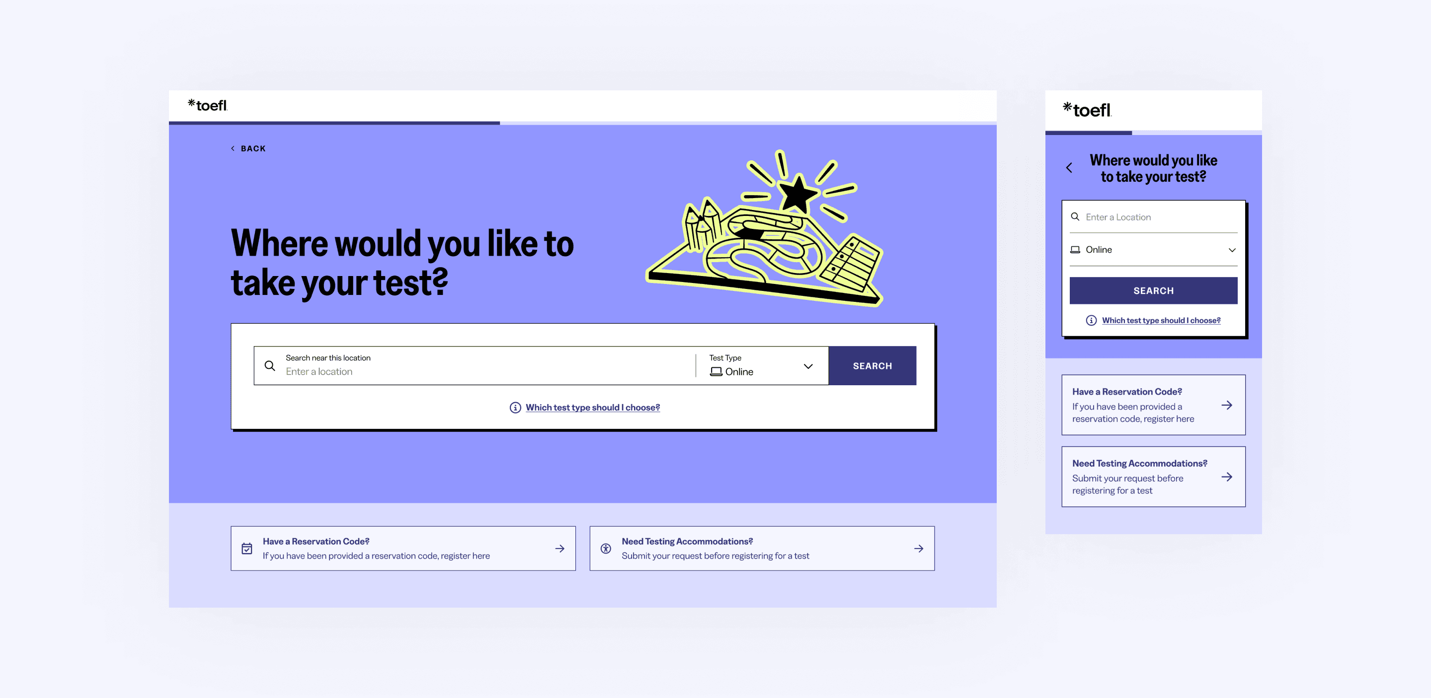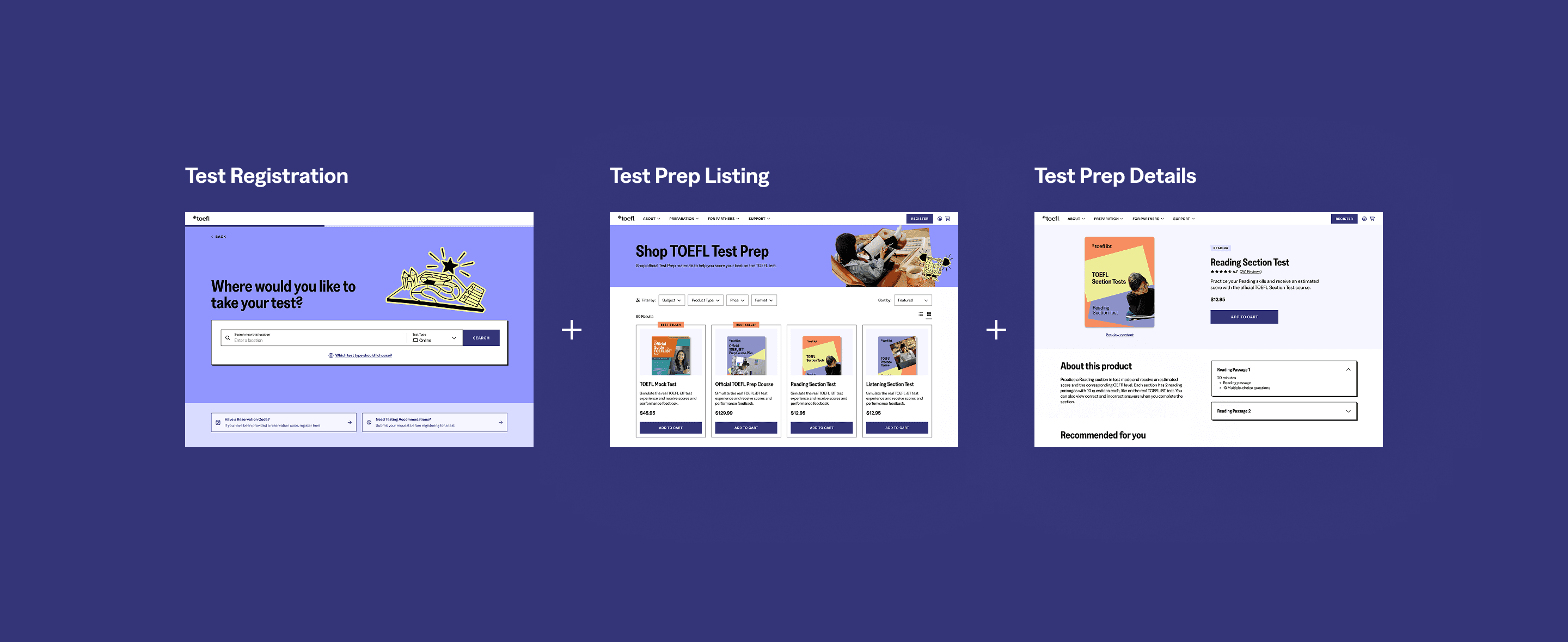 ETS is a company that offers a range of standardized tests for students and professionals worldwide. One of the most popular of these tests is TOEFL, an English proficiency test used by international students wanting to study in English-speaking countries. Alongside a tech ask to replatform their site to Salesforce, we were tasked from a UX/UI perspective to improve the test-taker journey, holistically.