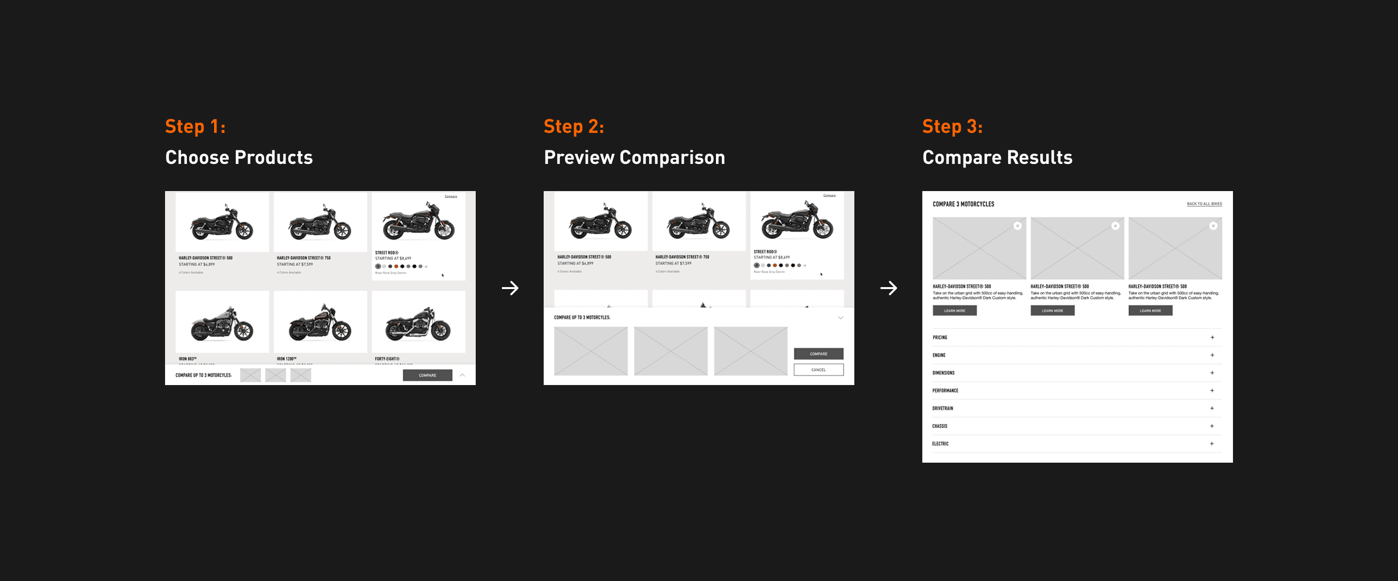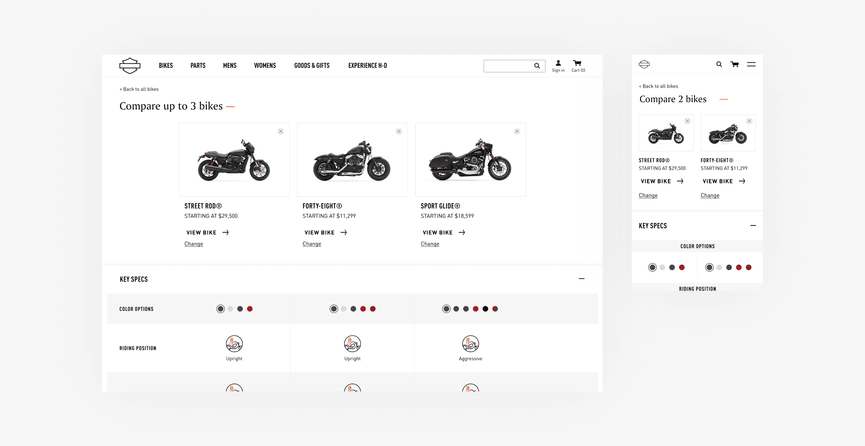 The previous version of the Compare tool was disjointed and did not include all products on the site. We needed to create a new, standardized template that would work for all products: Motorcycles, Parts, and Merchandise.