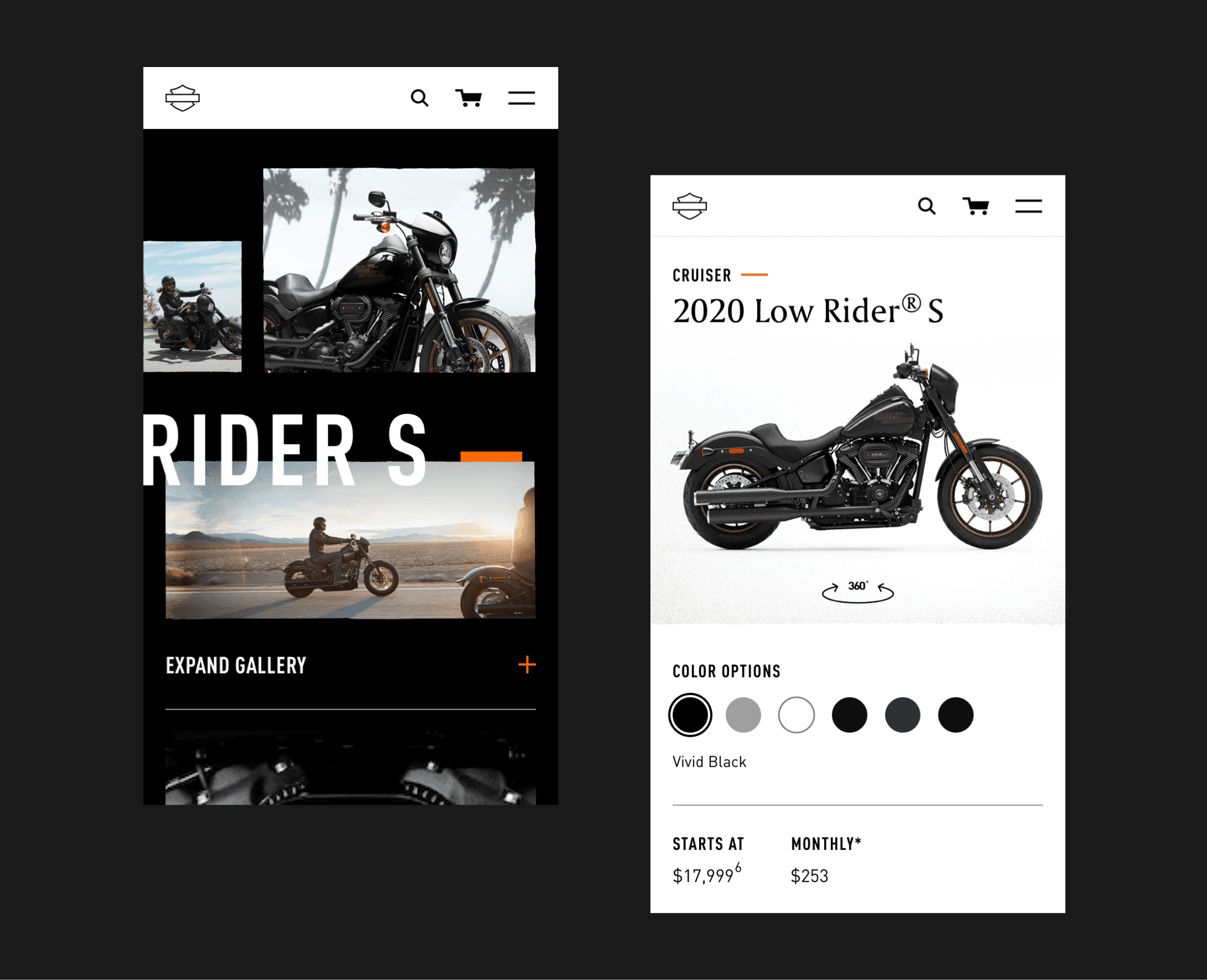 Motorcycle ridership was down amongst the younger audience. We needed to reintroduce Harley-Davidson to this demographic in a way that met them where they were. We were also tasked with bringing together two disparate e-commerce experiences: Bikes and Parts and Merchandise.