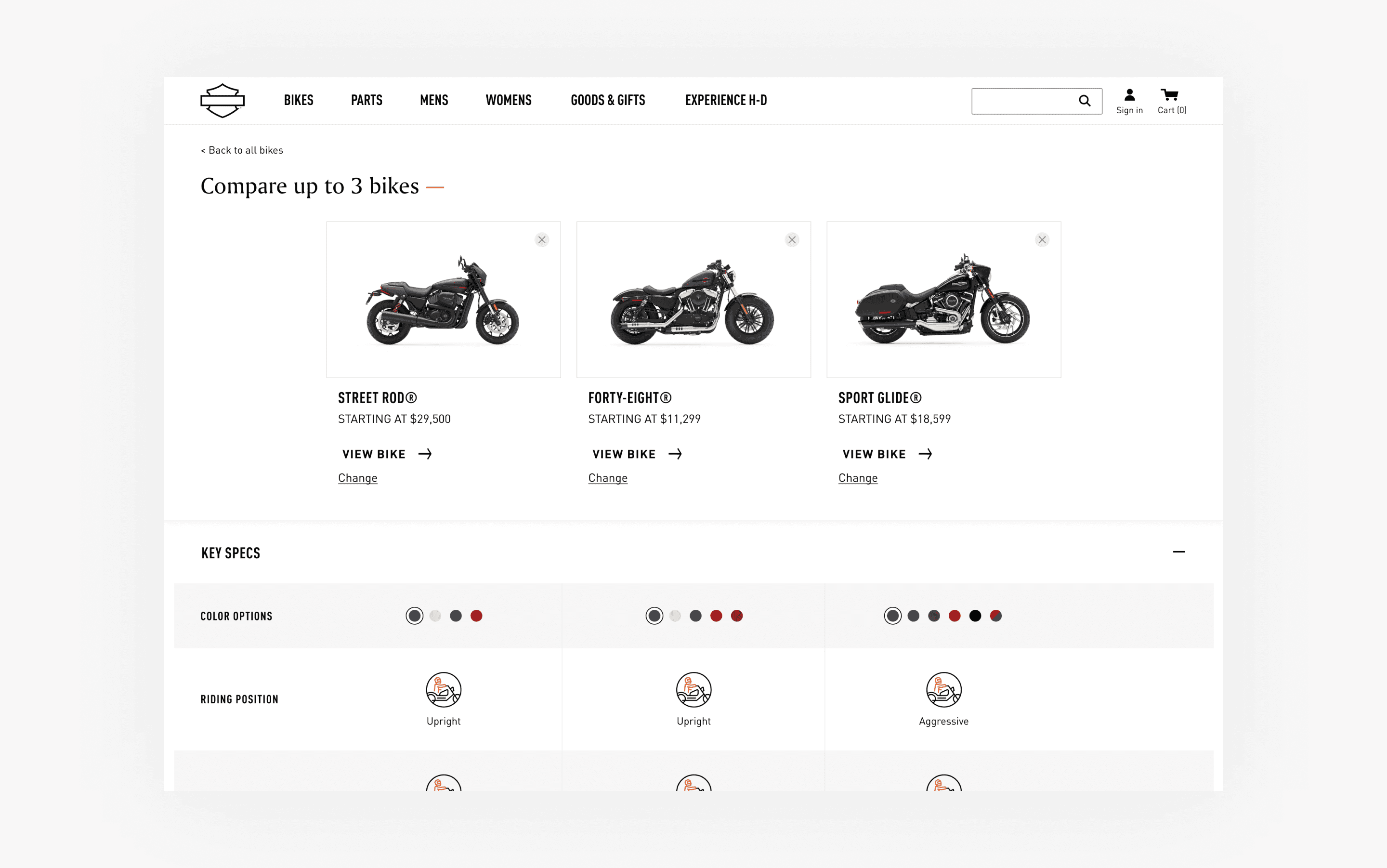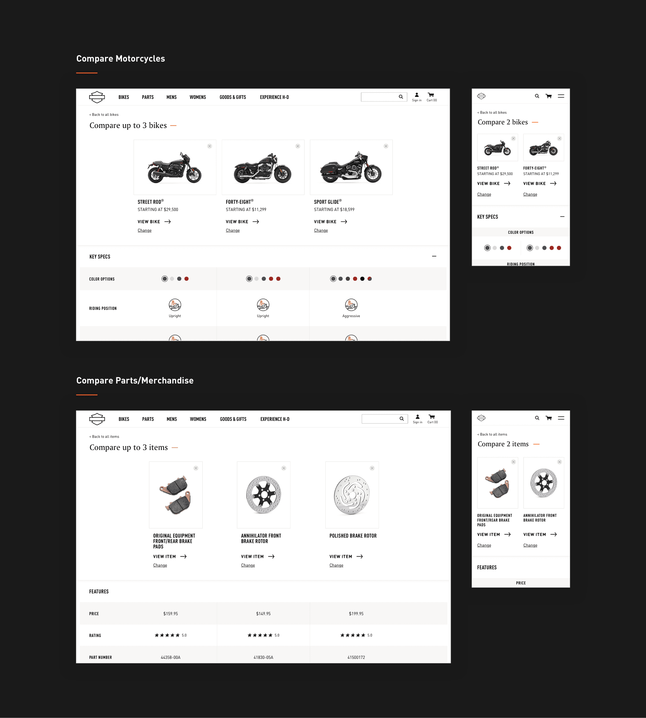 The final design accommodated for Comparing Bikes and Parts and Merchandise using the same layout, with a mobile version that functions just as well as desktop.