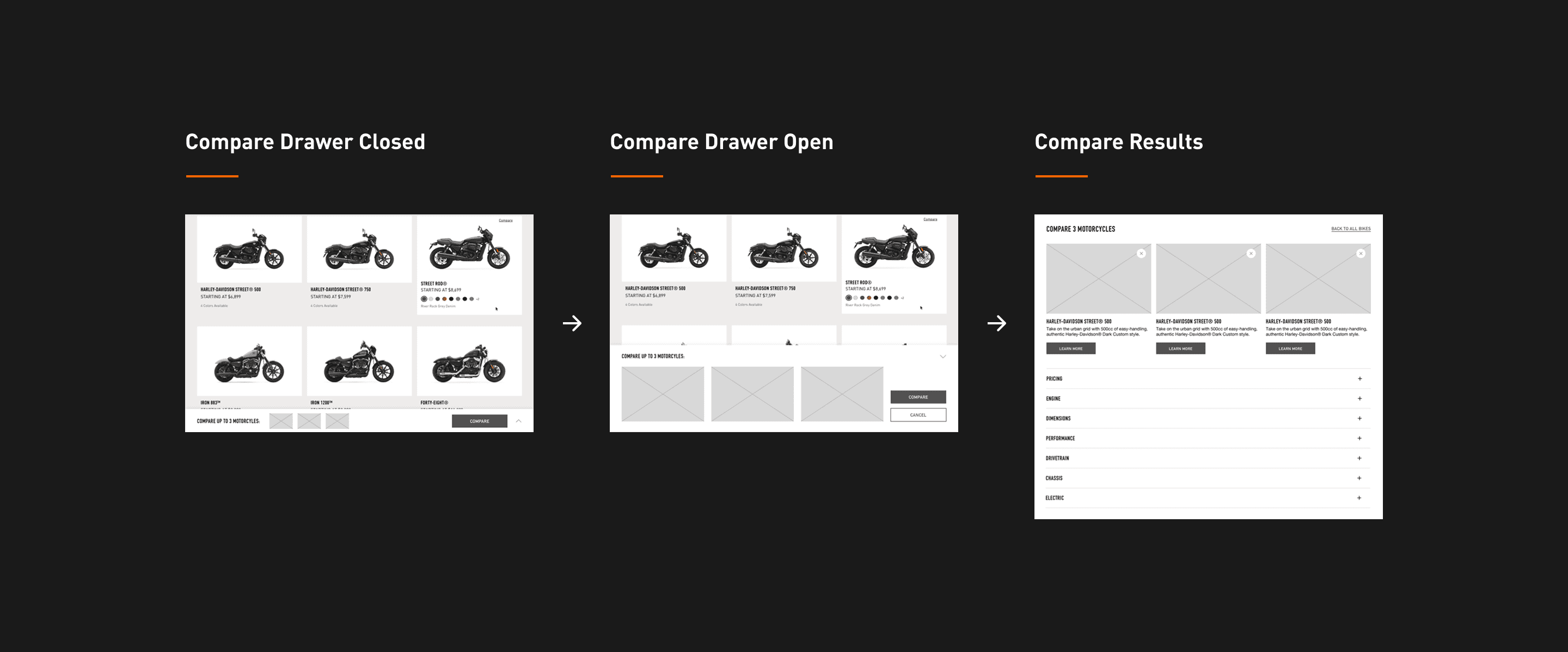 The new version of the Compare tool needed to be all-encompassing, and include Motorcycles, Parts and Merchandise. A mobile version did not currently exist for comparing Parts and Merchandise.